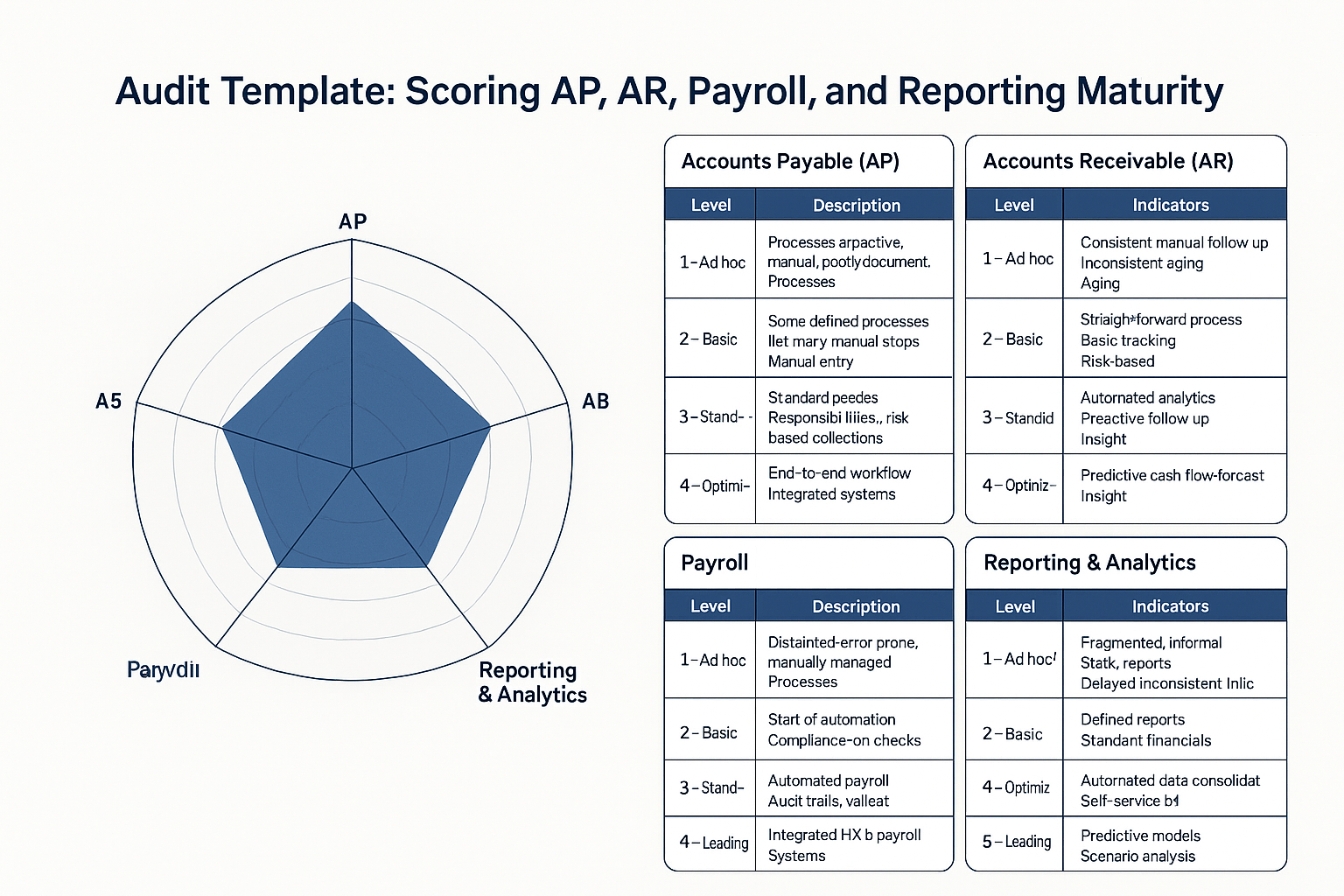 - Define scope – Decide which areas (AP, AR, Payroll, Reporting) and which dimensions you’ll assess.